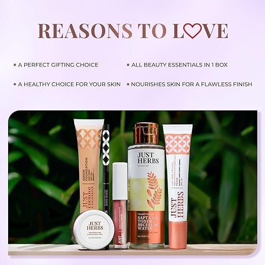 About this makeup kit: Just Herbs Makeup Kit for Women with Kohl Kajal, 3 in 1 Primer, Liquid Lipstick, Serum Foundation, Saptajal Toner and Lip & Cheek Tint (Gift Set)