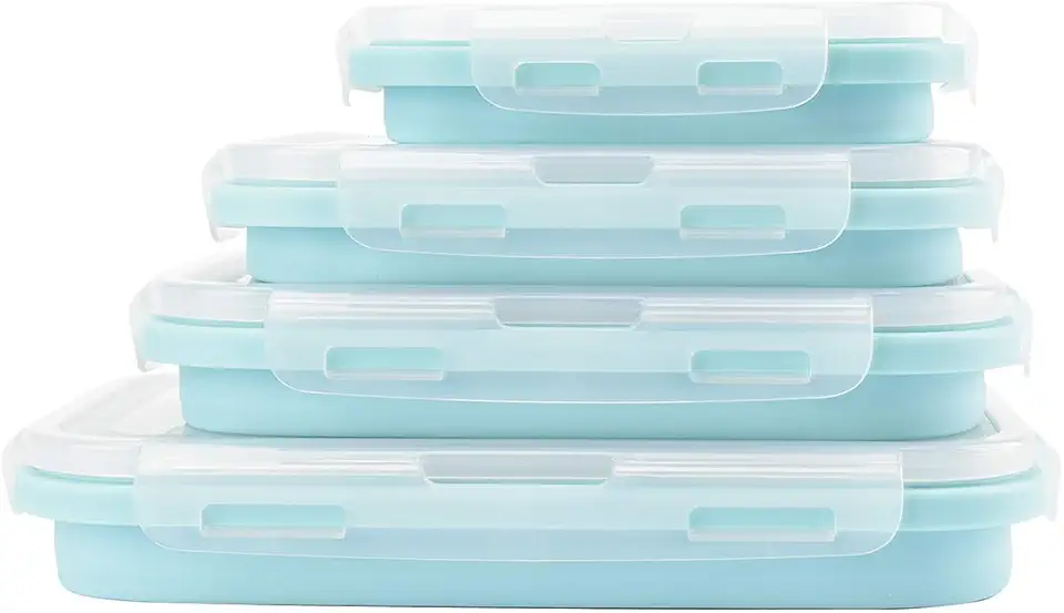 Collapsible Food Air tight container. BPA FREE with AIRTIGHT PLASTIC LID – Each container is made of BPA free food-grade silicone that is non-toxic, tasteless, odorless, non-stick and easy to clean. Airtight covers make these great for the office, classroom, camping, road trips and more